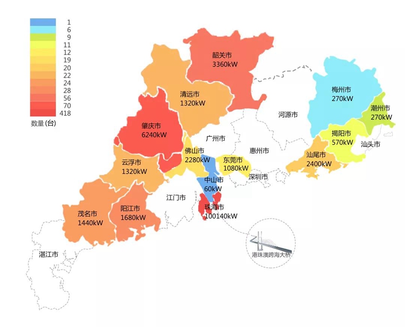 2018年,在港珠澳大桥充电桩项目中,青岛秉文铭德电子科技有限公司在港珠澳大桥珠海端口岸人工岛搭建的充电管理平台及电能量采集终端,为大桥的绿色运营和电力保障提供技术支持。除此之外,仅广东省内,青岛秉文铭德电子科技有限公司充电桩涵盖肇庆、珠海等14个城市,具体分布情况如下图所示。